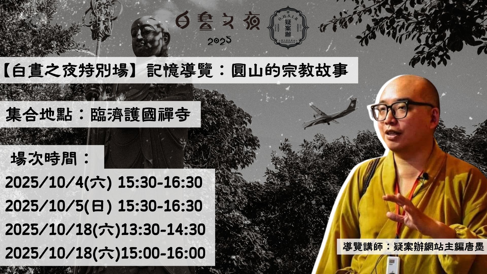 2025年的白晝之夜與疑案辦團隊合作規劃導覽,由疑案辦網站主編唐墨老師及疑案辦副主任路那老師以「圓山的百年軌跡」、「圓山的宗教故事」兩者為軸線,一起跨越歷史,尋找你所不知道的圓山故事!